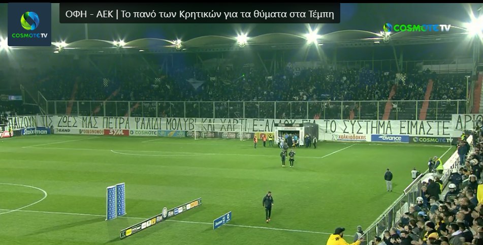 Περίπου στο 57ο λεπτό του αγώνα του ΟΦΗ με την ΑΕΚ οι οπαδοί των δύο ομάδων φώναξαν κοινό σύνθημα για το έγκλημα των Τεμπών.