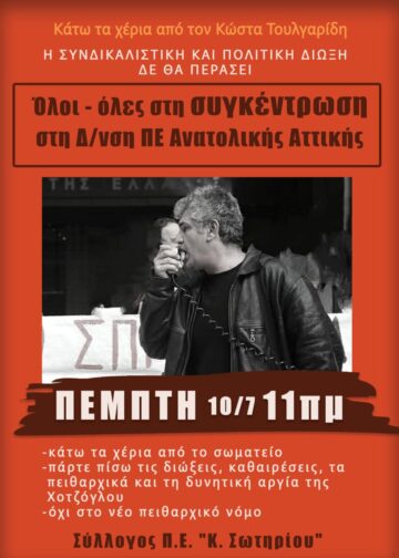Σήμερα στη ΔΠΕ Ανατολικής Αττικής ενάντια στη σκευωρία και τη στημένη δίωξη του Κώστα Τουλγαρίδη...