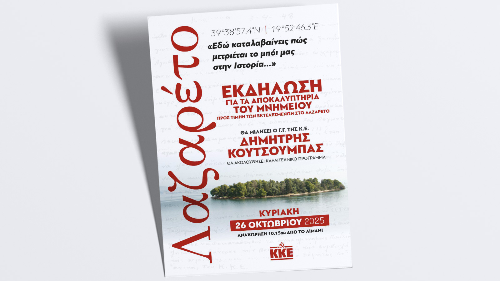 Η Κεντρική Επιτροπή του ΚΚΕ διοργανώνει την Κυριακή 26 Οκτώβρη στο Λαζαρέτο της Κέρκυρας μεγάλη εκδήλωση τιμής και μνήμης με τίτλο «Εδώ καταλαβαίνεις πώς μετριέται το μπόι μας στην Ιστορία...», στην οποία θα γίνουν τα αποκαλυπτήρια του μνημείου προς τιμήν των εκτελεσμένων αγωνιστών που μαρτύρησαν στο νησάκι.