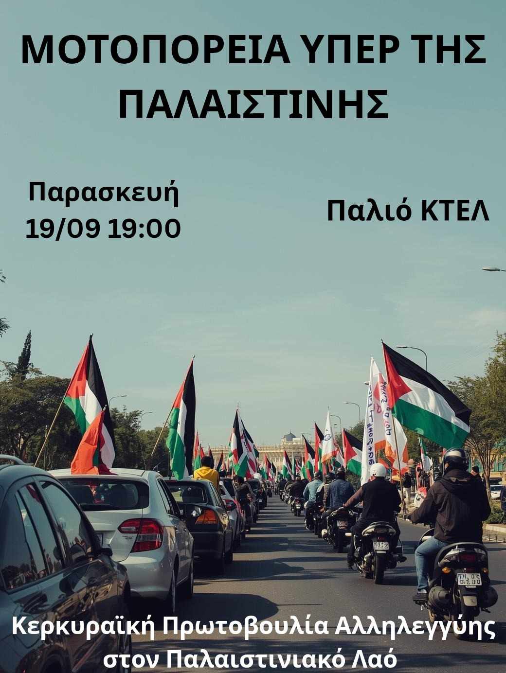 Η Κερκυραϊκή Πρωτοβουλία Αλληλεγγύης στον Παλαιστινιακό Λαό διοργανώνει μοτοπορεία υπέρ της Παλιστίνης την Παρασκευή 19 Σεπτέμβρη στις 19.00 στο παλιό ΚΤΕΛ