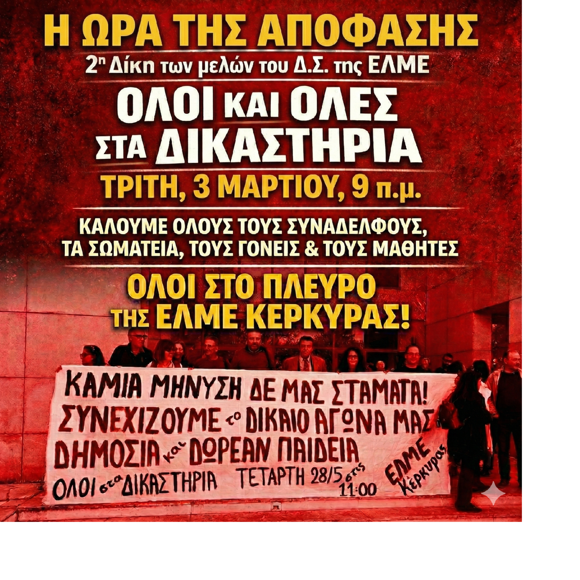 Πανηγυρική αθώωση των μελών του ΔΣ της ΕΛΜΕ Κέρκυρας μετά από τριήμερη ακροαματική διαδικασία....