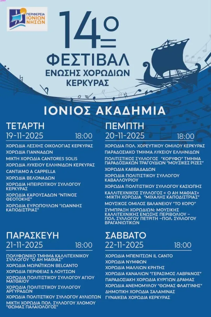 Το 14ο φεστιβάλ της Ένωσης Χορωδιών Κέρκυρας - Τετάρτη 19/11 έως και το Σάββατο 22/11
