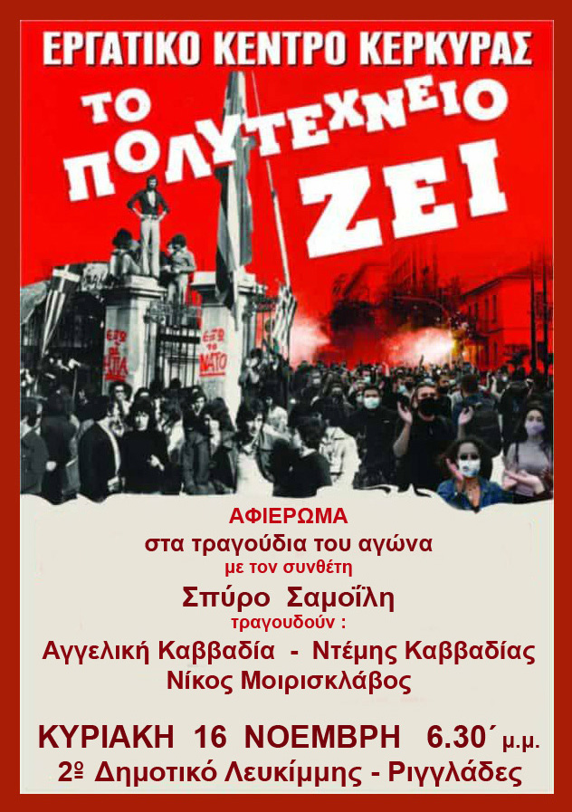 Μουσικό αφιέρωμα "Το Πολυτεχνείο Ζει" με τον συνθέτη Σπύρο Σαμοϊλη την Κυριακή 16 Νοεμβρίου στις...
