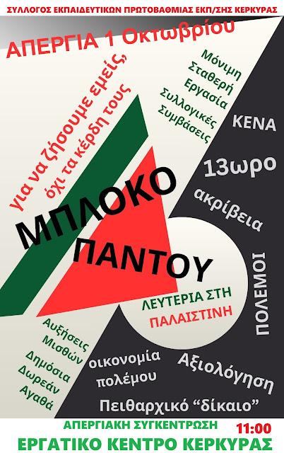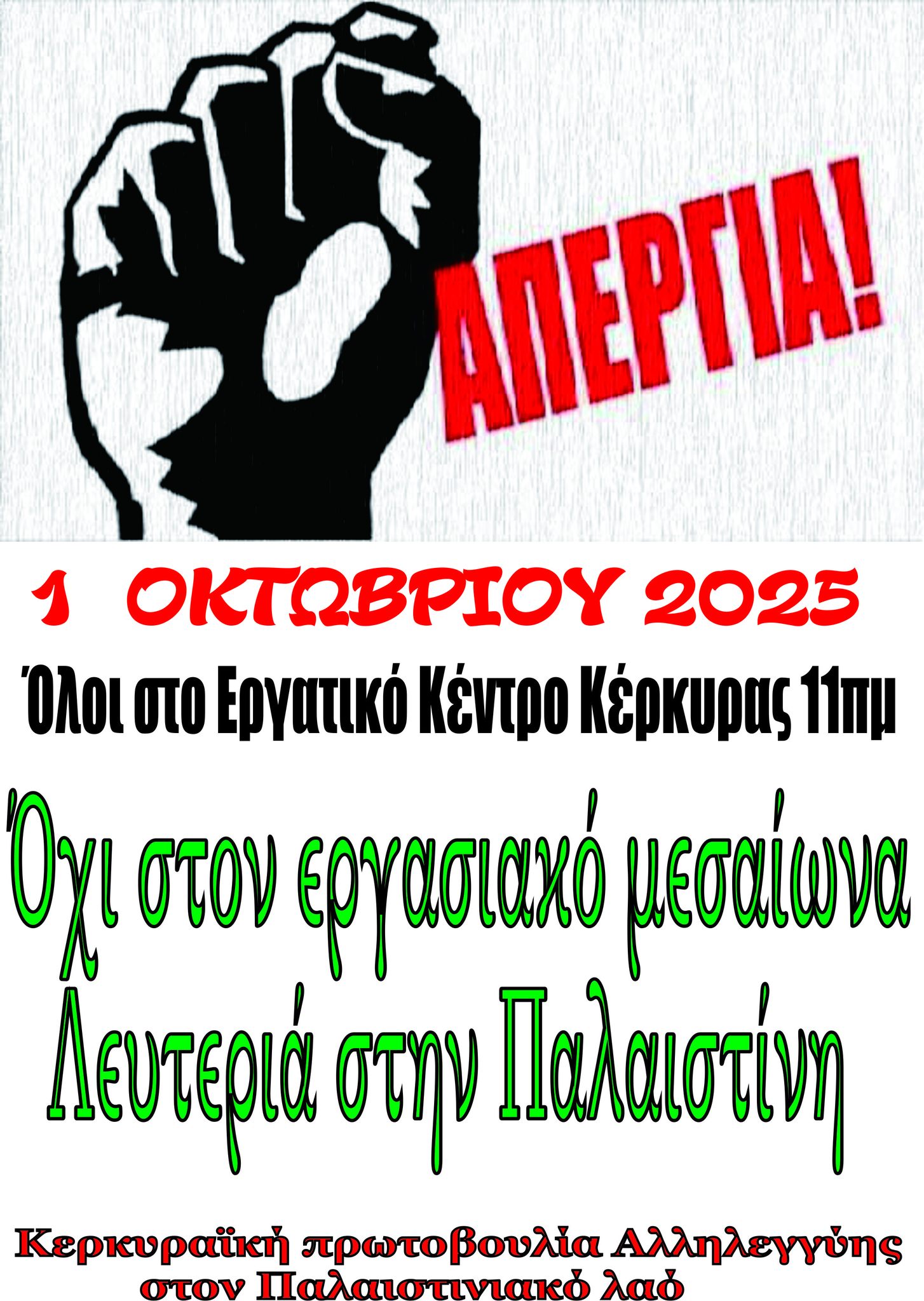 "Η Κερκυραϊκή Πρωτοβουλία Αλληλεγγύης στον Παλαιστινιακό Λαό συμμετέχει στην απεργία της 1ης...