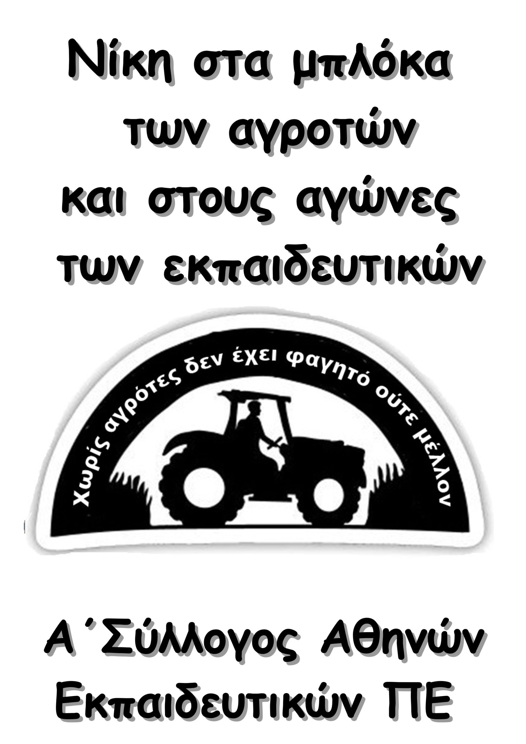 Το Δ.Σ. του Α΄ Συλλόγου Αθηνών Εκπαιδευτικών ΠΕ εκφράζει την στήριξη του στους βιοπαλαιστές αγρότες, κτηνοτρόφους, αλιείς και μελισσοκόμουςπου εδώ και δύο ολόκληρους μήνες με τον ανυποχώρητο αγώνα τους, τα μεγαλειώδη τους μπλόκα, μετατρέπουν Εθνικές Οδούς και κόμβους σε «κάστρα αγώνα» απέναντι στην πολιτική που τους ξεκληρίζει στην κυριολεξία. Απέναντι δηλαδή στην Κοινή Αγροτική Πολιτική της ΕΕ και της κυβέρνησης, που στο επίκεντρό της έχει τη συγκέντρωση της παραγωγής σε όλο και λιγότερα χέρια.