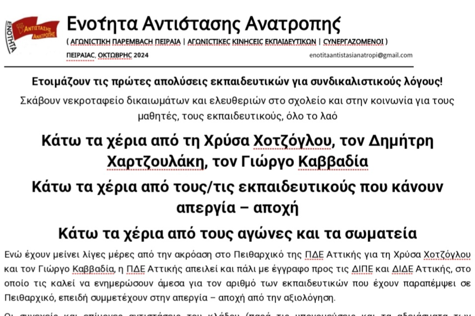 Ενότητα Αντίστασης Ανατροπής ( ΑΓΩΝΙΣΤΙΚΗ ΠΑΡΕΜΒΑΣΗ ΠΕΙΡΑΙΑ | ΑΓΩΝΙΣΤΙΚΕΣ ΚΙΝΗΣΕΙΣ ΕΚΠΑΙΔΕΥΤΙΚΩΝ |...