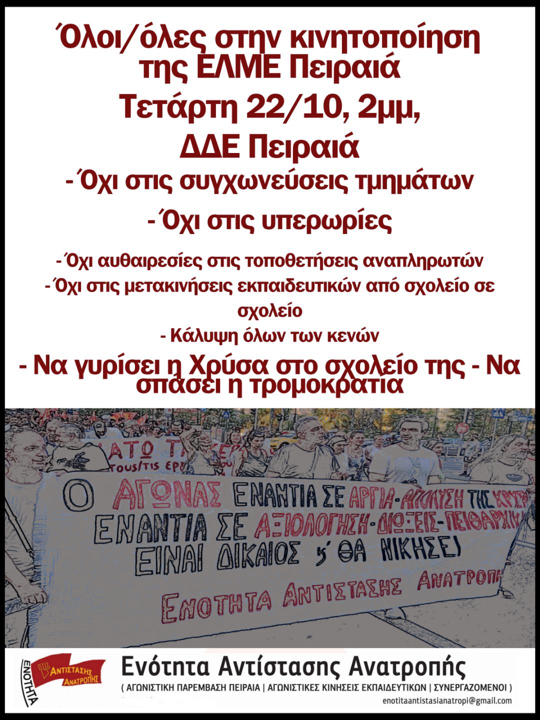 Όλες -οι στην κινητοποίηση της Τετάρτης 22/10 στη ΔΔΕ Πειραιά για...