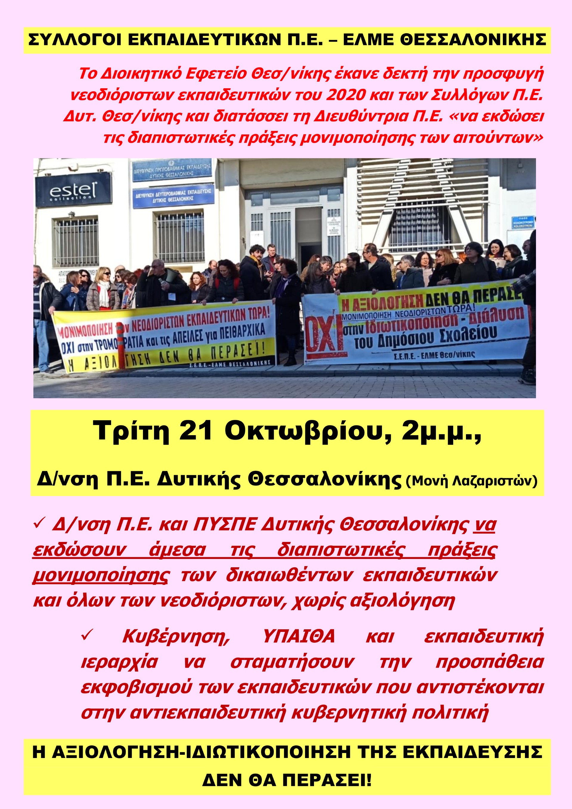 Οι Σύλλογοι Εκπαιδευτικών Π.Ε. της Δυτικής Θεσσαλονίκης μαζί με όλα τα Εκπαιδευτικά Σωματεία της...