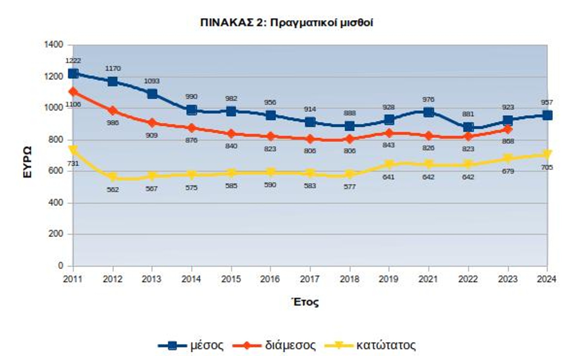 Ο σφαγιασμός των μισθών ξεκίνησε το 2012, με την τότε Υπουργική Απόφαση που επέβαλλε μια τεράστια μείωση στον κατώτατο μισθό κατά 22%. Από τότε μέχρι σήμερα, παρά τις ονομαστικές αυξήσεις, ο πραγματικός κατώτατος μισθός διαμορφώθηκε στα 731 ευρώ το 2025, φτάνοντας ύστερα από 14 ολόκληρα χρόνια στα επίπεδα του πραγματικού κατώτατου μισθού του 2011, των 732 ευρώ. Παράλληλα, εξακολουθεί να είναι μειωμένος ο μέσος μισθός σε ονομαστικές τιμές κατά 7,22% και σε πραγματικές κατά 21%, όπως προκύπτει από τα στοιχεία του ΕΦΚΑ για τον Μάρτιο των ετών 2025 και 2011.